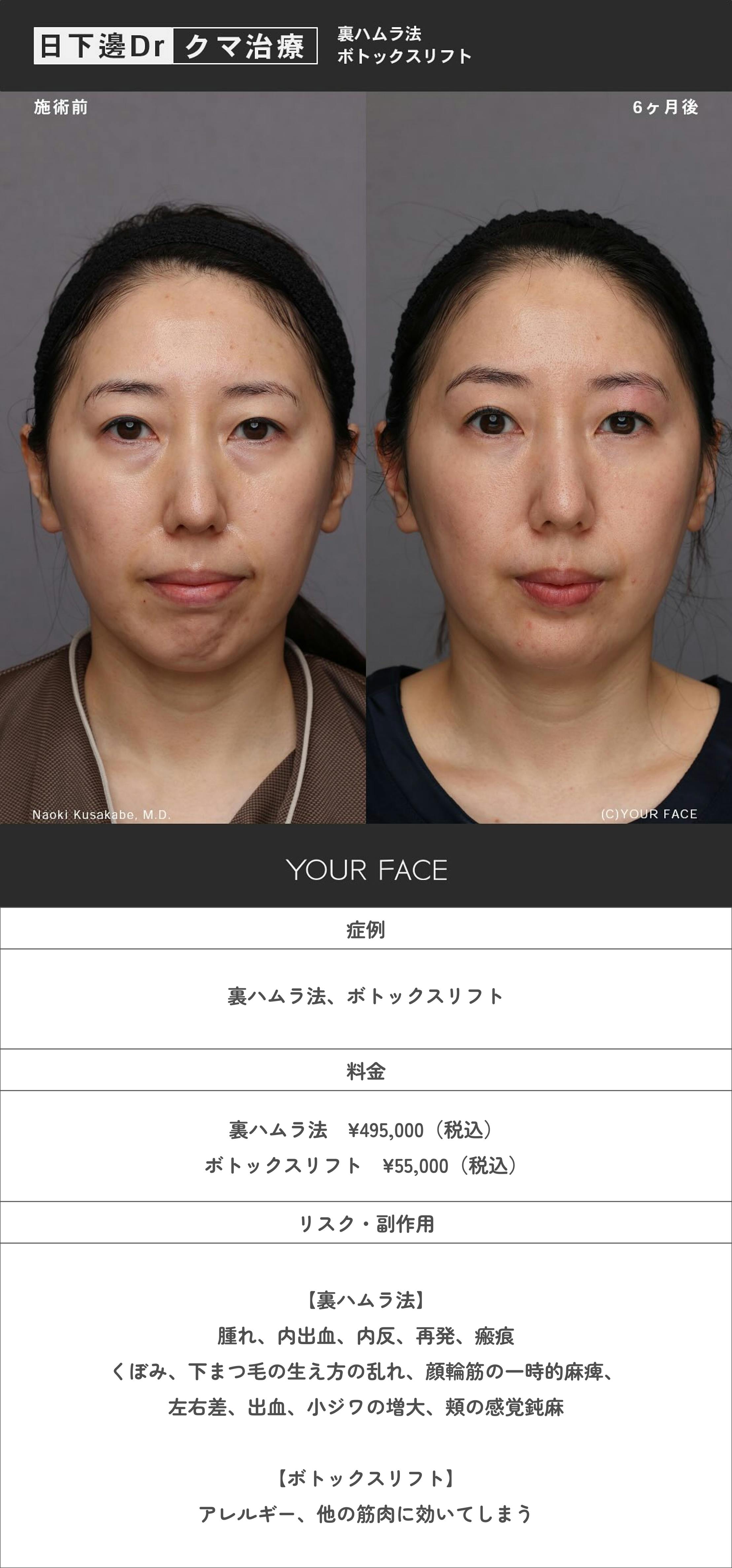 裏ハムラ法でクマを改善し、ボトックスリフトで下顔面のもたつきや梅干しジワにアプローチしました。