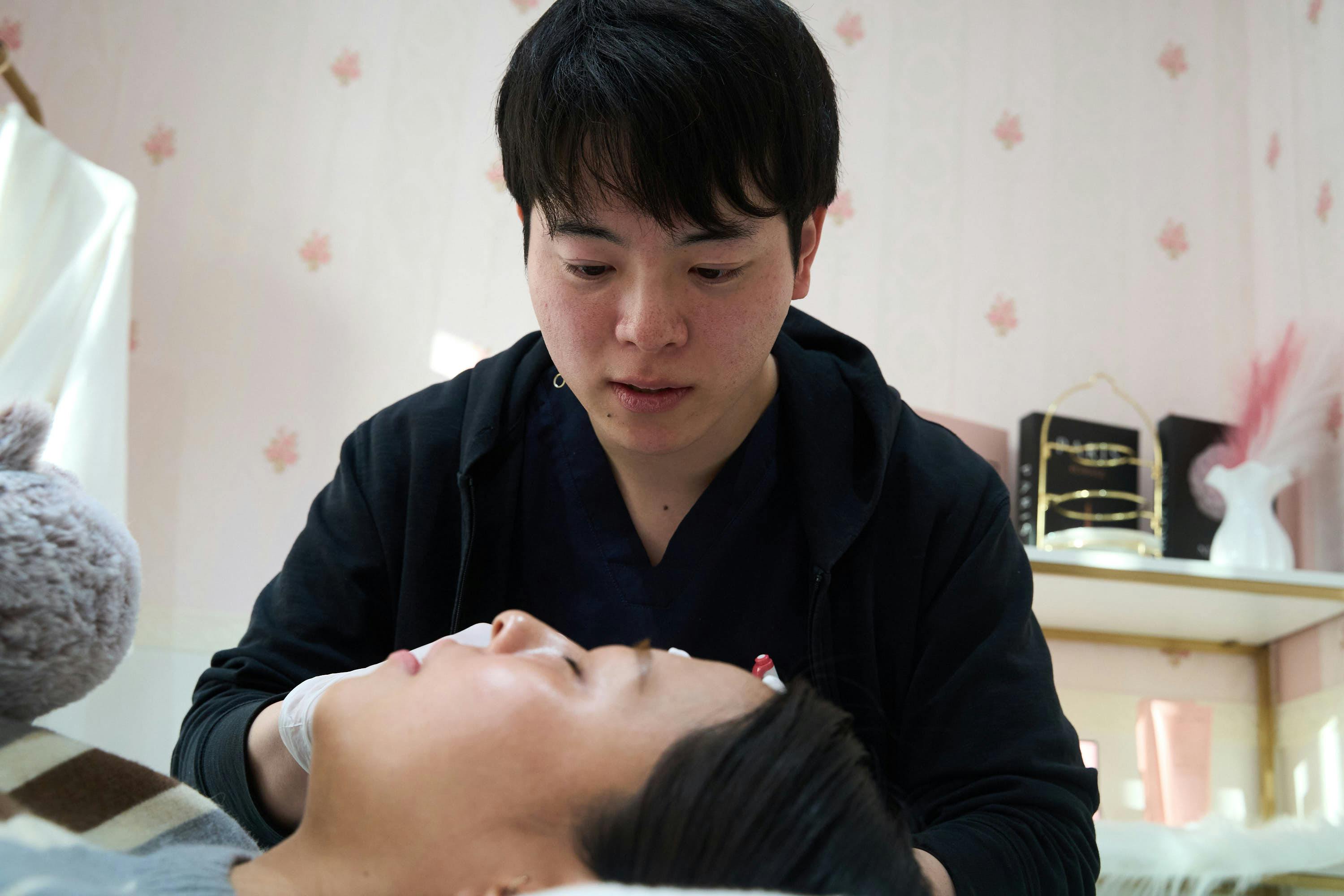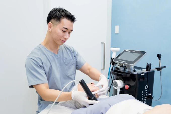施術台に寝た状態で待っていると医師が入ってきて、顎と口角の筋肉の動きを確認したあとにボトックスを打っていきます。